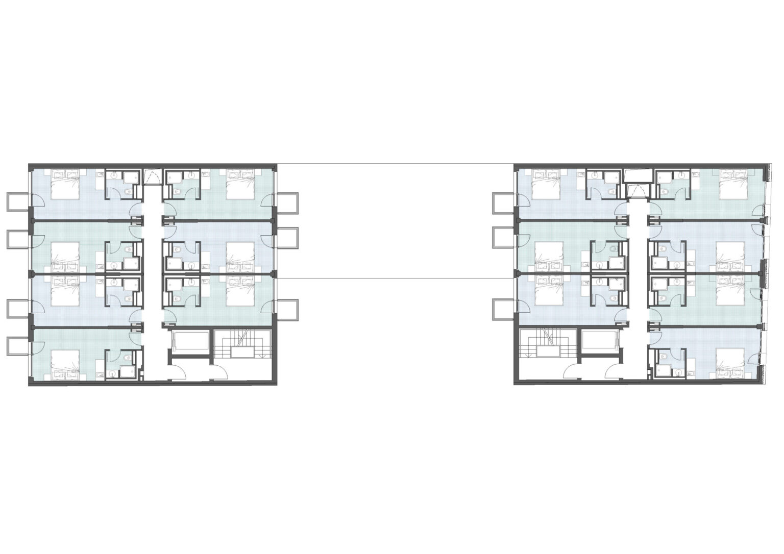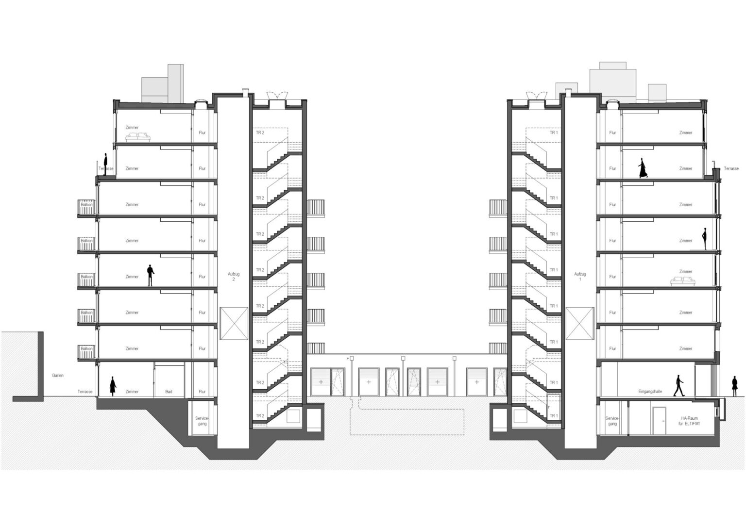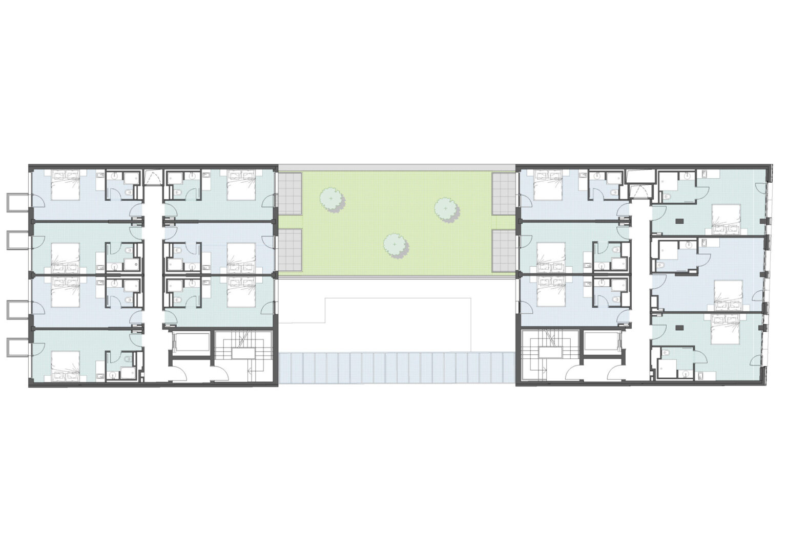 Im Berliner Ortsteil Gesundbrunnen entsteht auf einem schmalen, langgestreckten Grundstück ein Boardinghouse mit 104 Zimmern und einer Gewerbeeinheit. Das 8-geschossige, unterkellerte Gebäude knüpft mit seinen 2 Baukörpern an den traditionellen Berliner Bautypus mit Vorder- und Hinterhaus an. Die Fassaden zu den Höfen sind als Lochfassaden schlicht und einfach gehalten und werden mit Balkonen aufgelockert. Entlang der Ackerstraße erhält die Fassade eine 3-Teilung. Der 2-geschossige Sockel mit einer Verkleidung aus Metallpaneelen trägt einen 4-geschossigen Baukörper mit horizontalen Bändern, neben den Fenstern ‚hängen‘ gardinenähnliche Fassadenelemente. Den Gebäudeabschluss bilden die beiden letzten, verputzten Geschosse, die leicht zurückversetzt sind.