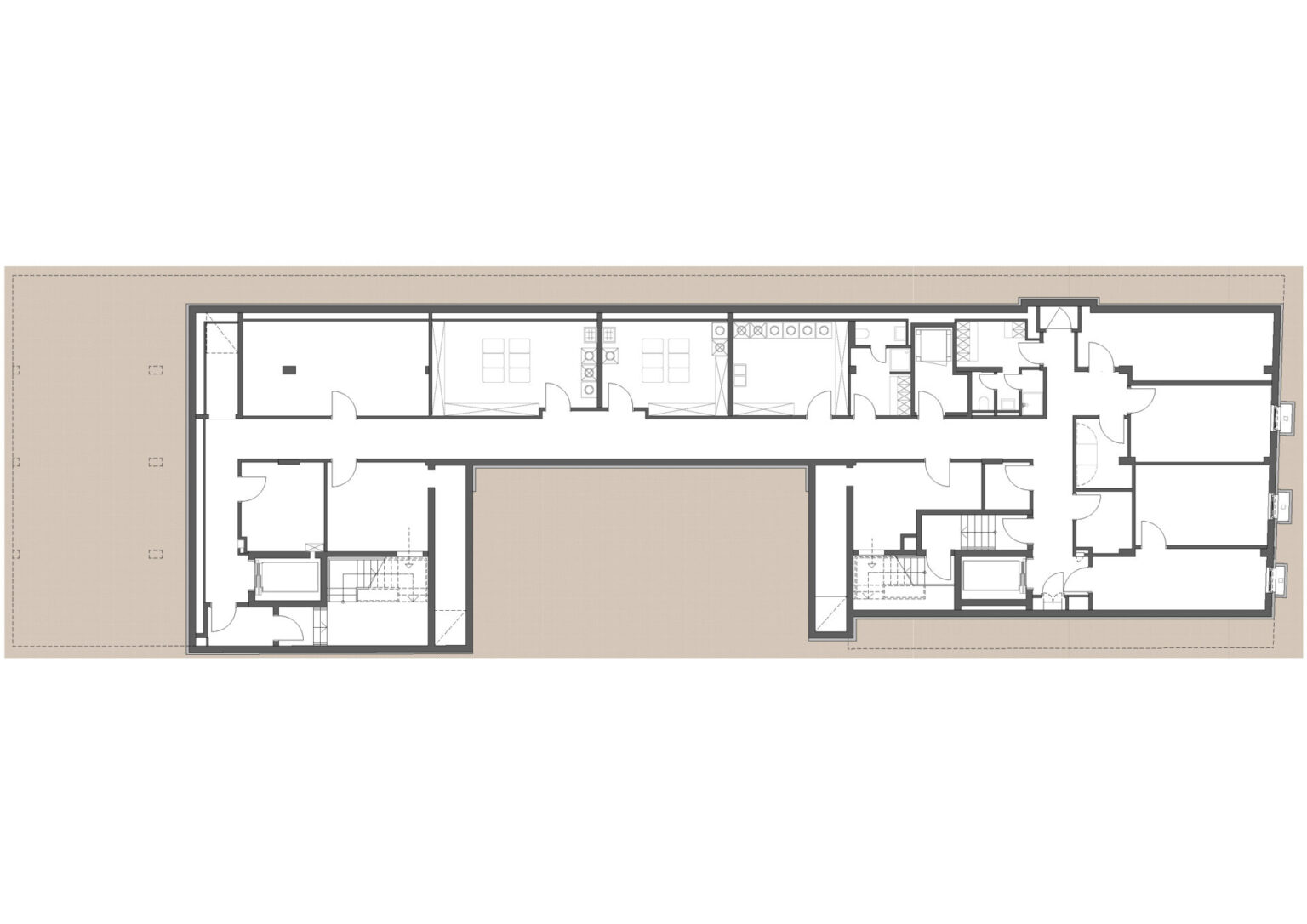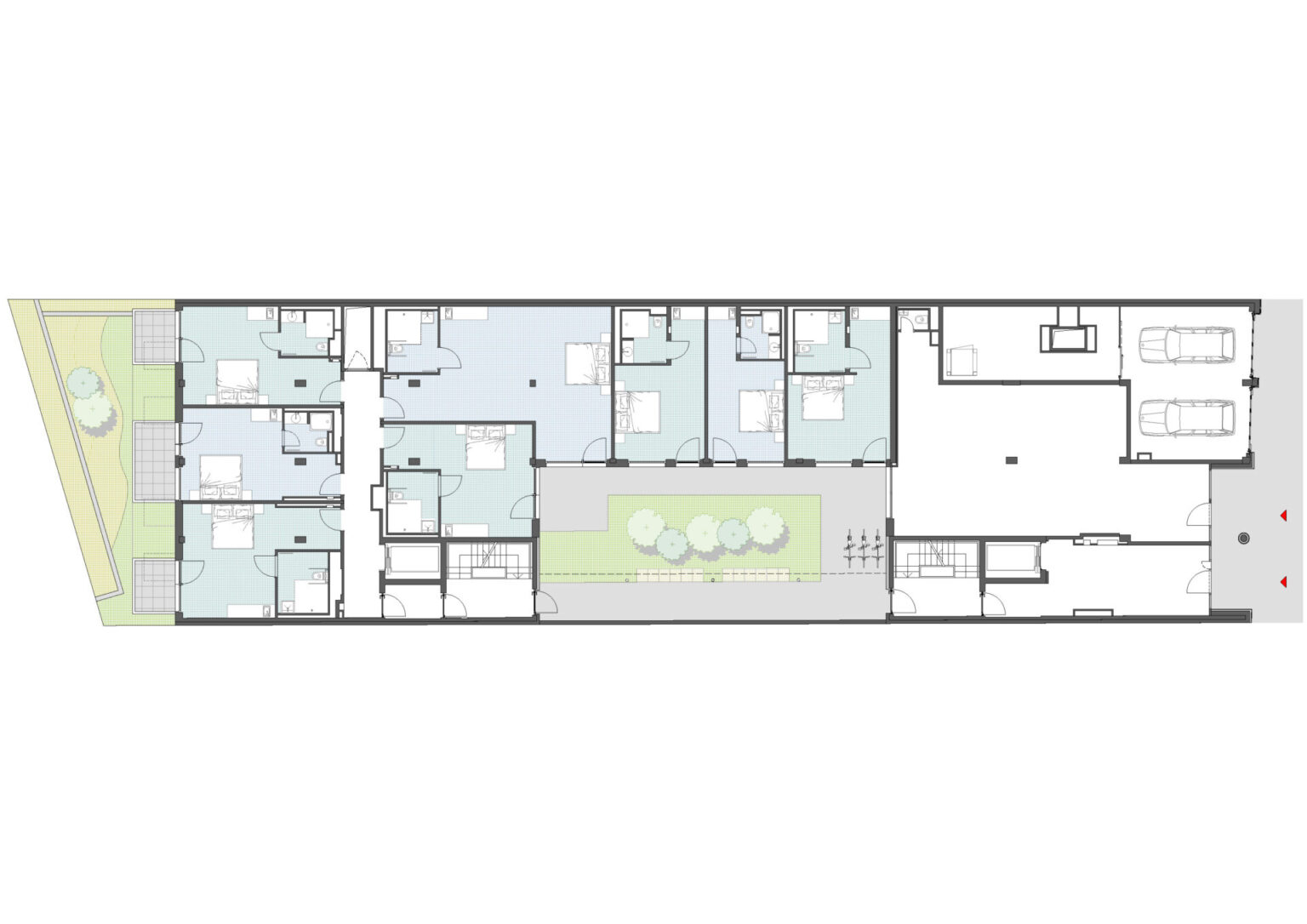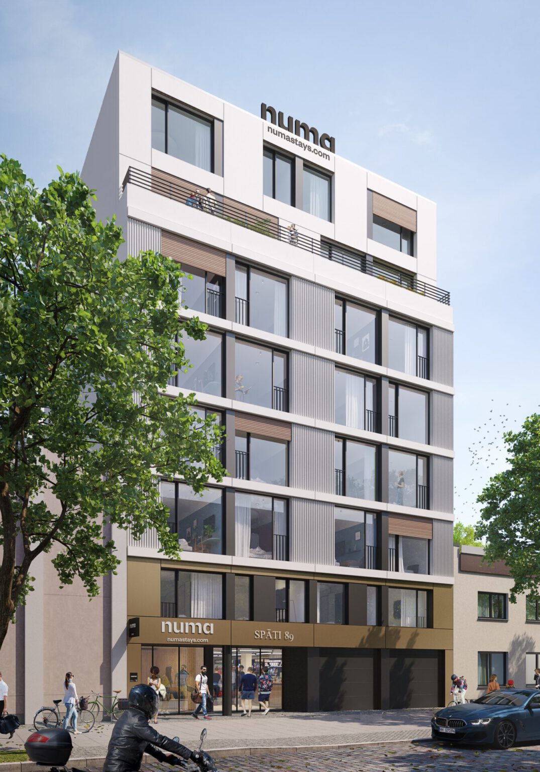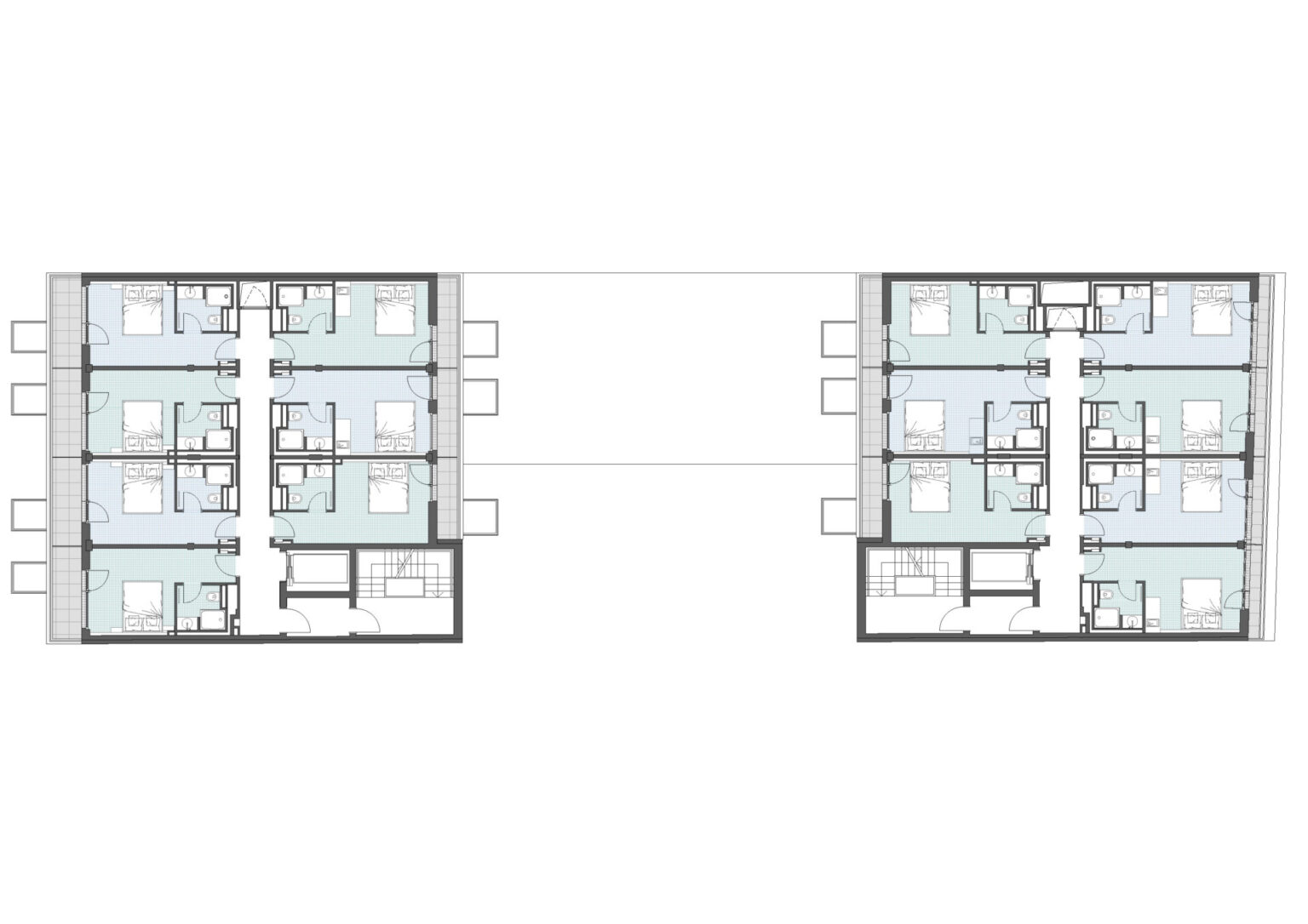 Im Berliner Ortsteil Gesundbrunnen entsteht auf einem schmalen, langgestreckten Grundstück ein Boardinghouse mit 104 Zimmern und einer Gewerbeeinheit. Das 8-geschossige, unterkellerte Gebäude knüpft mit seinen 2 Baukörpern an den traditionellen Berliner Bautypus mit Vorder- und Hinterhaus an. Die Fassaden zu den Höfen sind als Lochfassaden schlicht und einfach gehalten und werden mit Balkonen aufgelockert. Entlang der Ackerstraße erhält die Fassade eine 3-Teilung. Der 2-geschossige Sockel mit einer Verkleidung aus Metallpaneelen trägt einen 4-geschossigen Baukörper mit horizontalen Bändern, neben den Fenstern ‚hängen‘ gardinenähnliche Fassadenelemente. Den Gebäudeabschluss bilden die beiden letzten, verputzten Geschosse, die leicht zurückversetzt sind.
