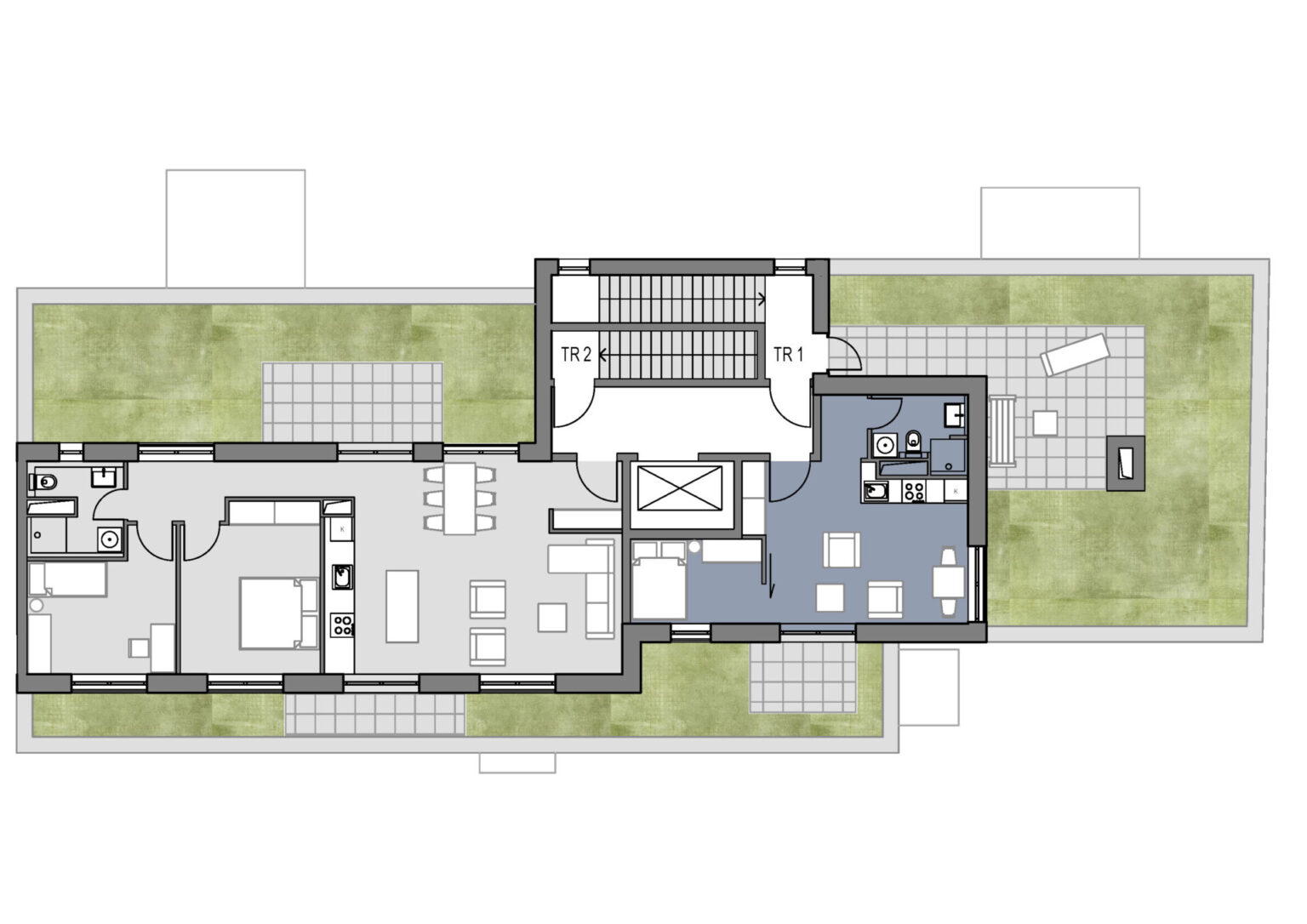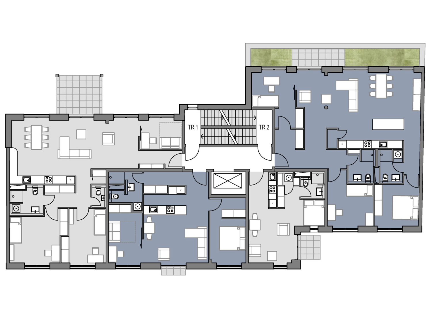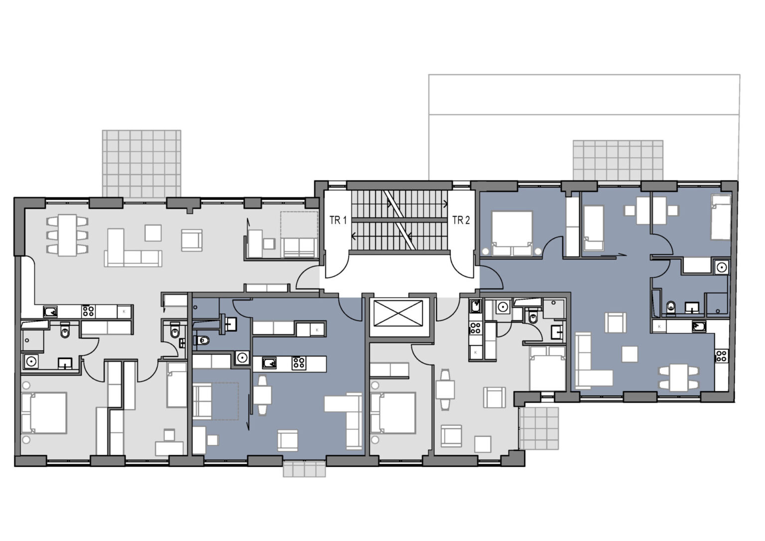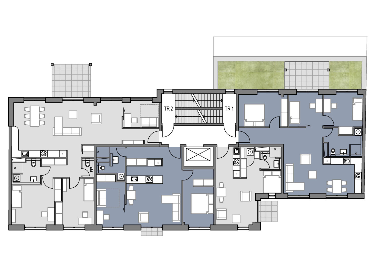 Die für eine Baugemeinschaft individuell gestalteten Wohnungen sind vierspännig um einen zentralen Erschließungskern angeordnet. Auf der begrünten Rückseite des Gebäudes befindet sich ein großer gemeinschaftlicher Garten. Zudem bietet die gemeinsame Dachterrasse im 4. Obergeschoss einen weiten Blick über die Leipziger Skyline.