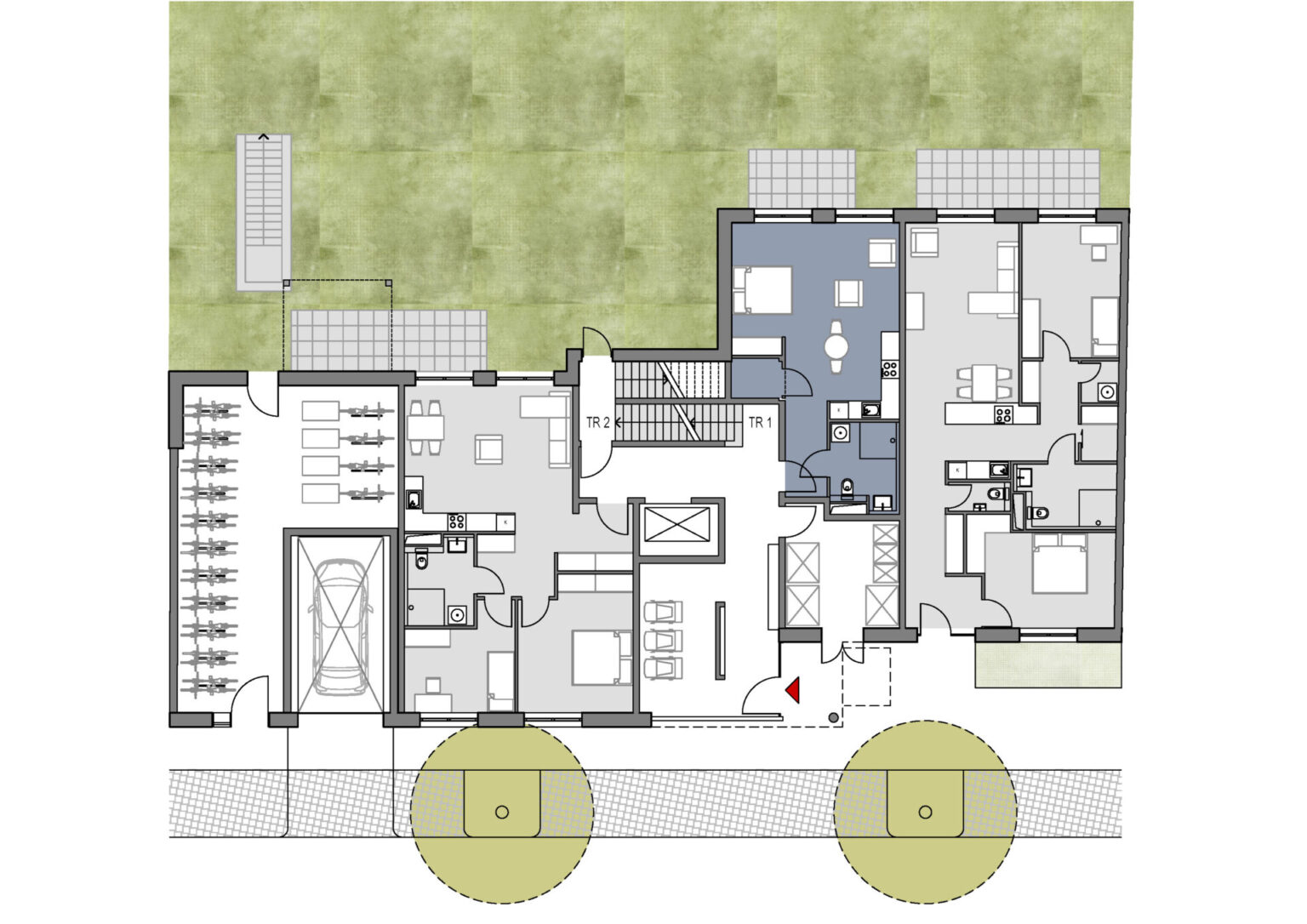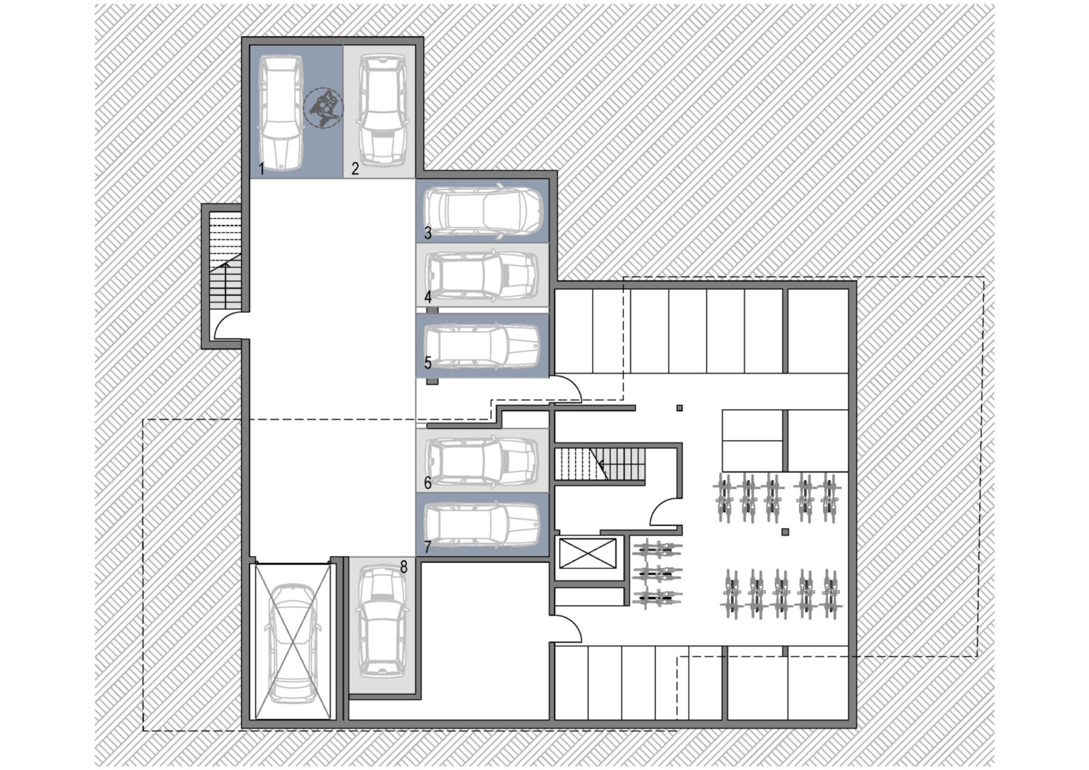 Im Untergeschoss befinden sich neben der Tiefgarage mit 8 PKW-Stellplätzen, die bequem über einen Aufzug erreichbar ist, Nebenräume sowie Abstellflächen für Fahrräder.
